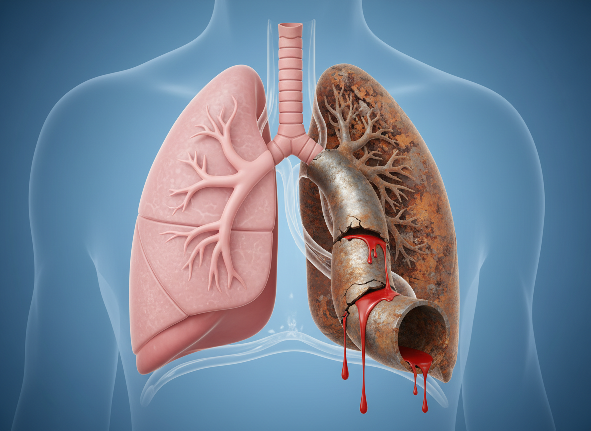 객혈의 가장 흔한 원인 중 하나는 '기관지확장증'입니다. 병명이 조금 어렵게 느껴지시나요? 쉽게 비유하자면, 우리 몸의 기관지를 '수도관'이라고 상상해 보세요. 오래된 수도관이 녹슬고 늘어나면 작은 충격에도 쉽게 균열이 생기고 물이 새어 나오겠죠?