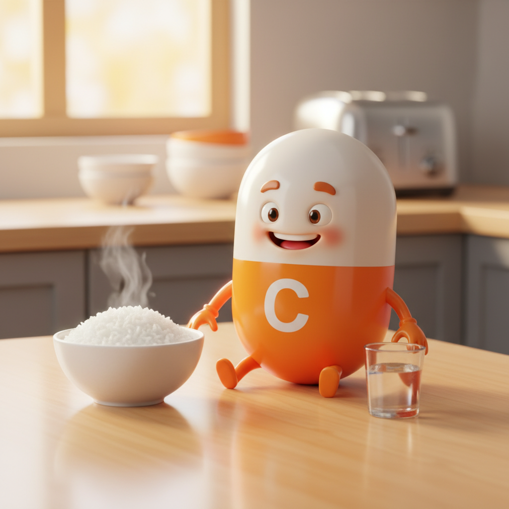 가장 이상적인 타이밍은 '식사 중' 혹은 '식사 직후'입니다. 음식물이 위장에 들어가면 소화를 돕기 위한 위산이 분비되고, 음식물과 비타민 C가 섞이면서 위벽에 닿는 직접적인 자극이 획기적으로 줄어듭니다. 또한, 우리가 섭취한 탄수화물 등이 대사되는 과정에서 발생하는 활성산소를 비타민 C가 즉각적으로 제거해 주는 항산화 효과도 기대할 수 있습니다. 밥숟가락을 내려놓자마자 물과 함께 드시는 것이 '국룰'입니다.