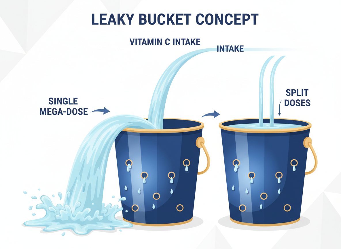 마치 구멍 난 물동이에 물을 붓는 것과 같습니다. 한 번에 엄청난 양의 물을 들이부어도, 동이의 크기(체내 흡수 한계치)를 넘어서는 물은 그대로 다 흘러버립니다. 일반적으로 비타민 C의 체내 반감기는 약 6시간 정도로 알려져 있습니다. 섭취 후 6시간이 지나면 농도가 급격히 떨어진다는 뜻입니다.