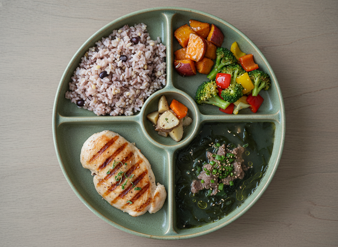 | 점심 | 닭가슴살 샐러드, 현미밥, 된장찌개(염도 낮게), 제철 과일 | 단백질, 식이섬유 |
