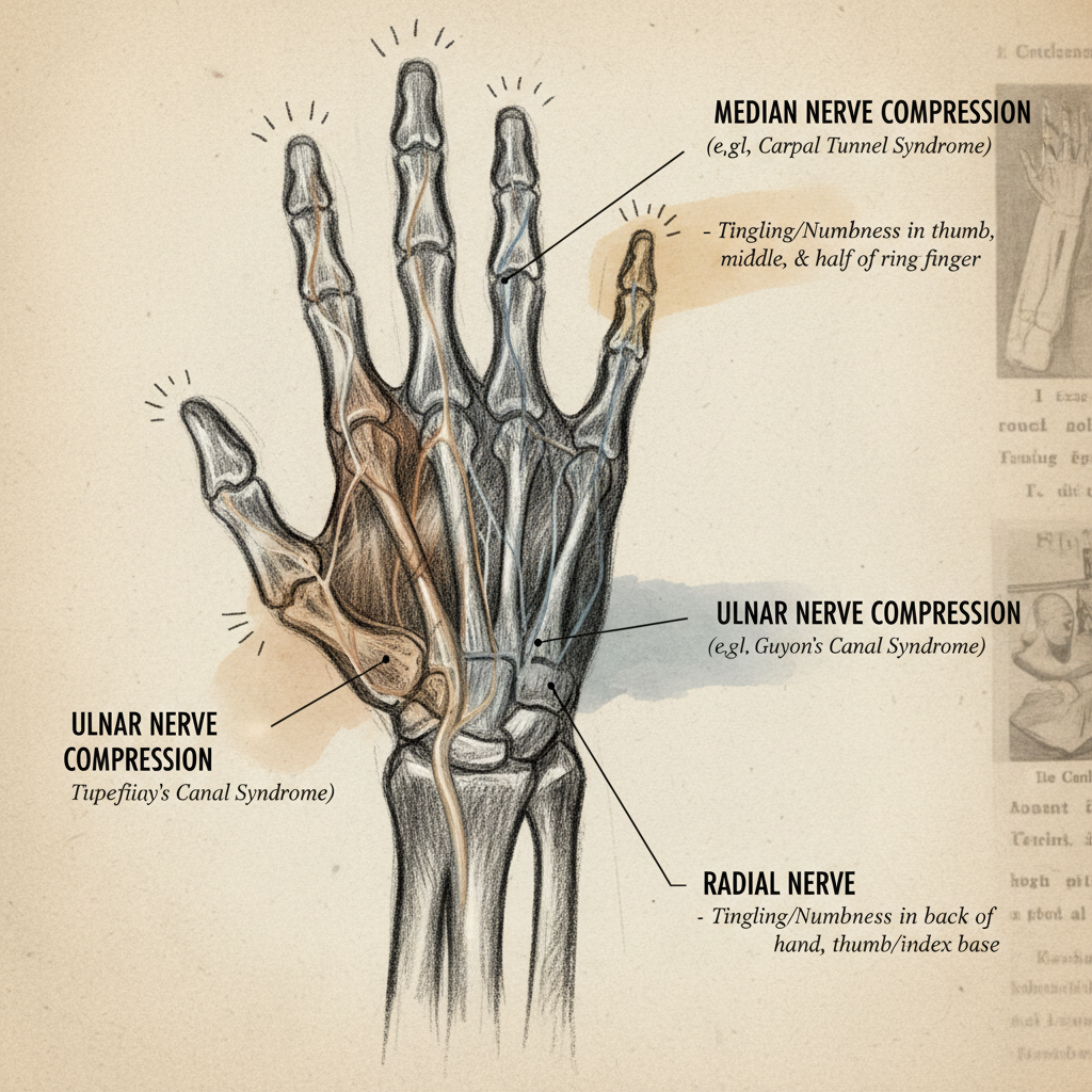 손끝 저림의 가장 흔한 원인 중 하나는 신경이 어딘가에서 압박을 받는 경우예요. 우리 몸에는 복잡하게 얽힌 신경망이 있는데, 이 신경들이 눌리면 다양한 감각 이상을 초래할 수 있습니다.